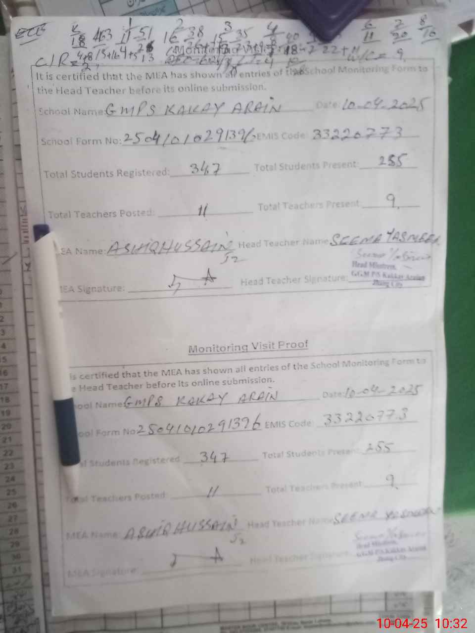 | Attendance Register | Head Teacher | MEA with School | Visit Proof |