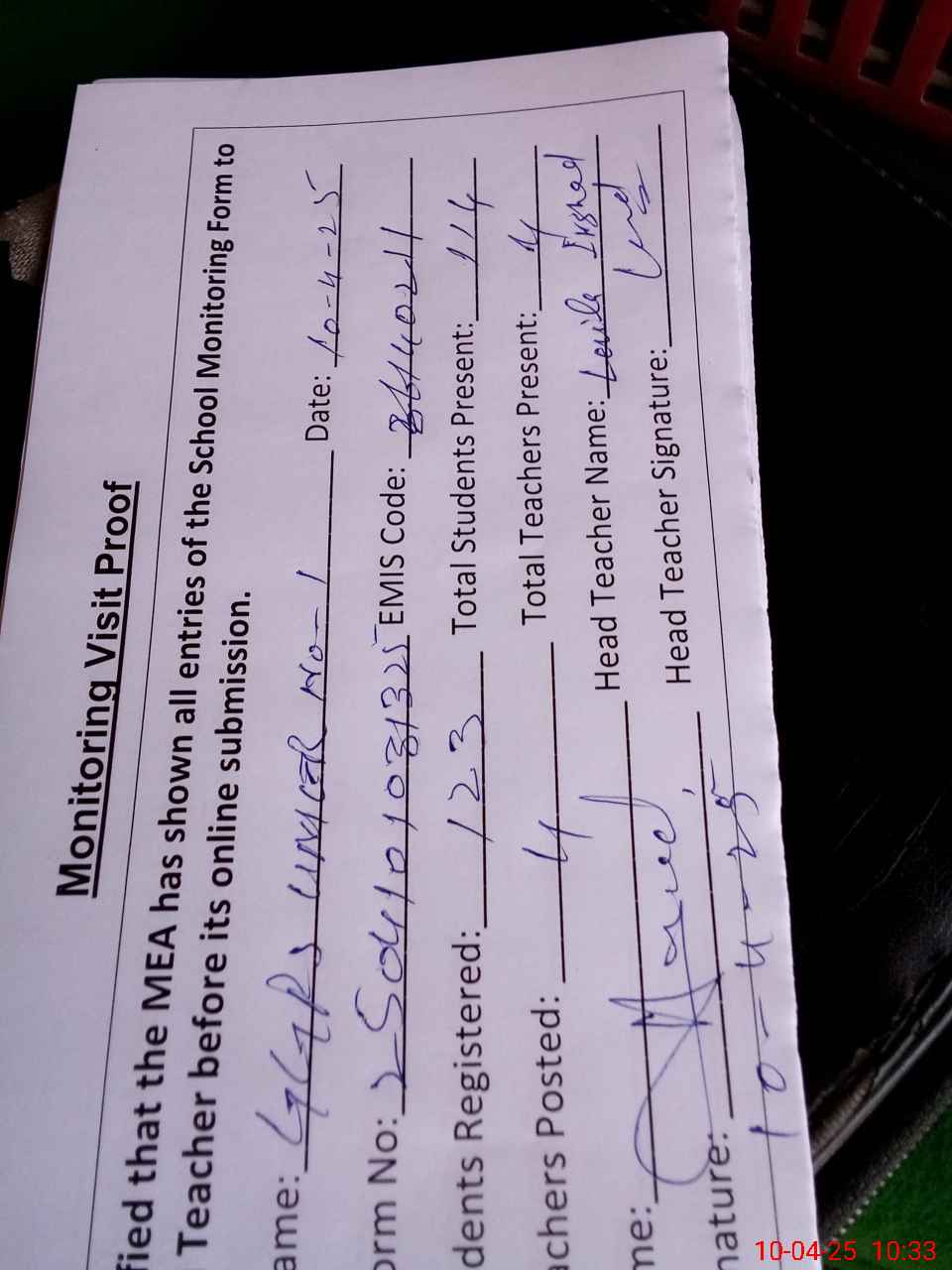| Attendance Register | Head Teacher | MEA with School | Visit Proof |