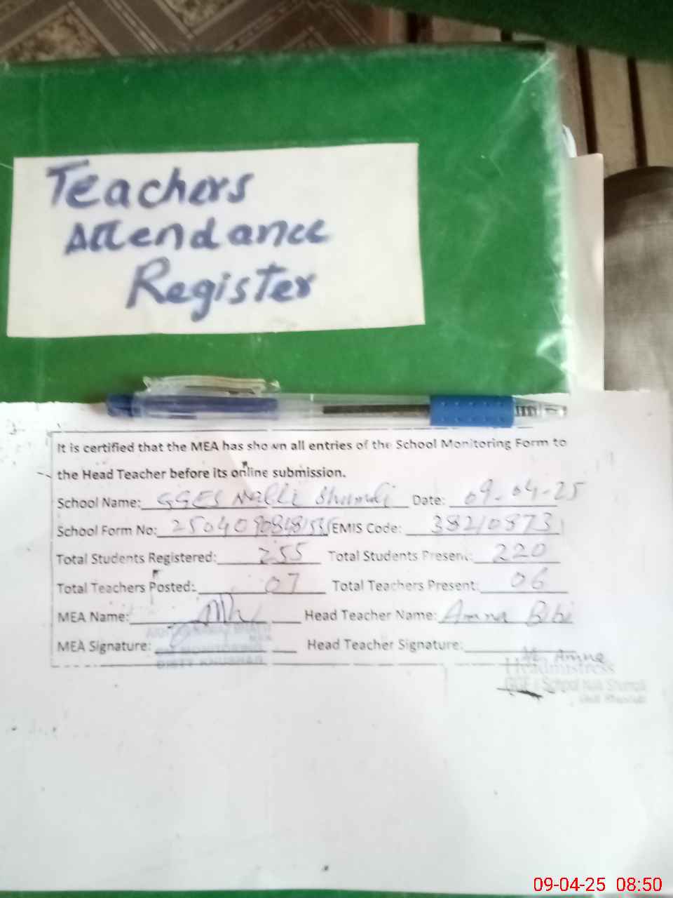 | Attendance Register | Head Teacher | MEA with School | Visit Proof |