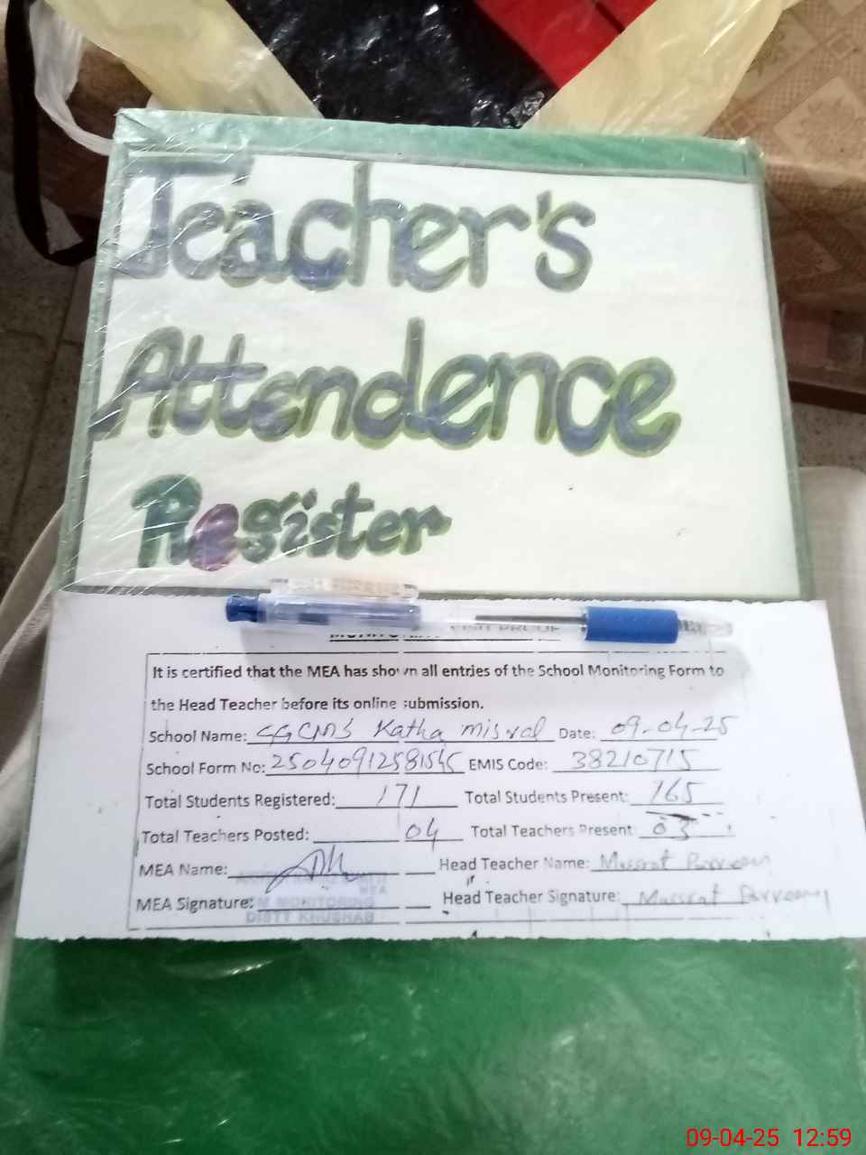 | Attendance Register | Head Teacher | MEA with School | Visit Proof |
