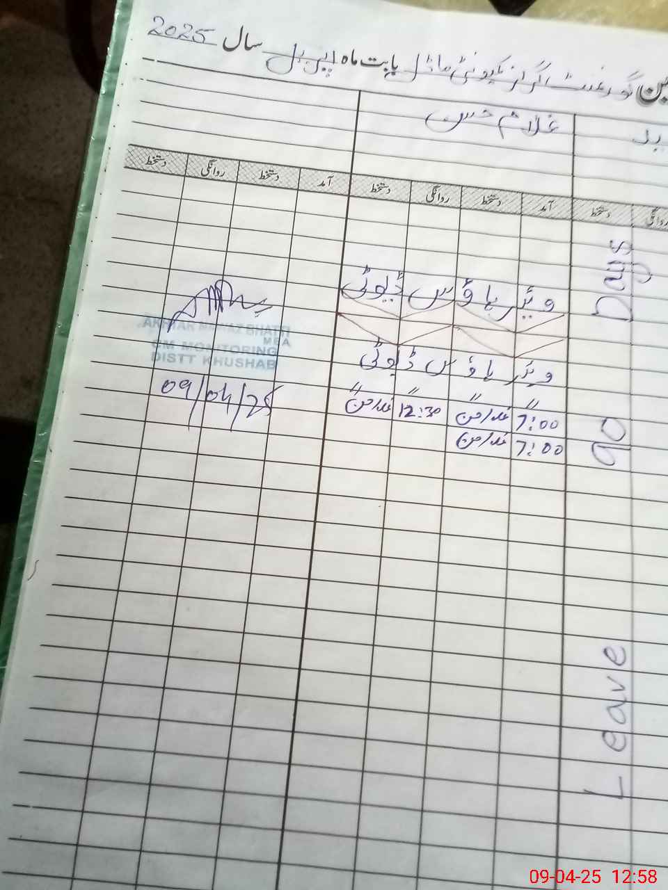 | CNIC | Full Name | Designation | R/C | Absence During Last Calender Month |