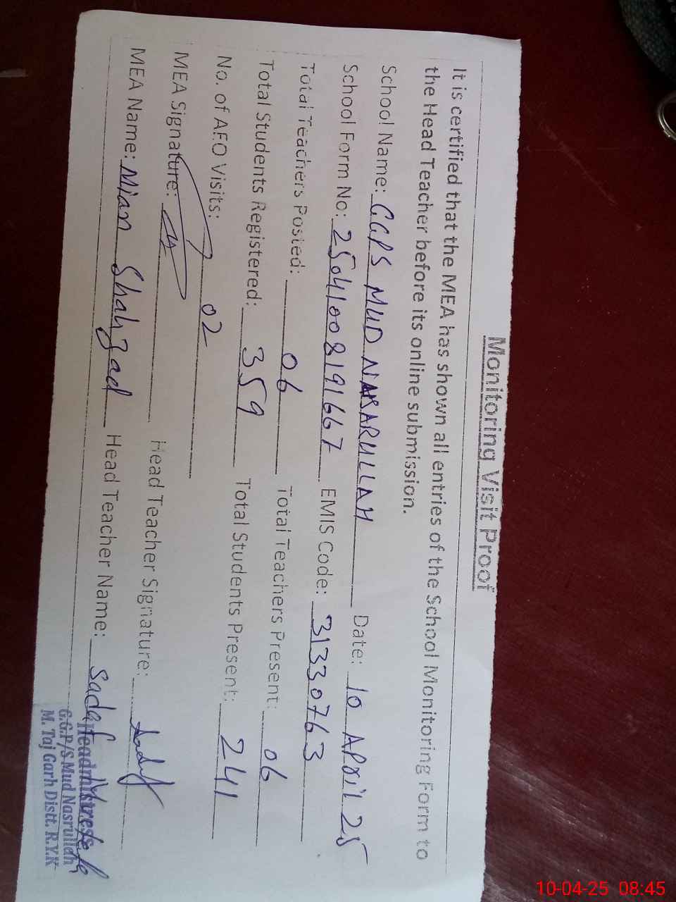| Attendance Register | Head Teacher | MEA with School | Visit Proof |