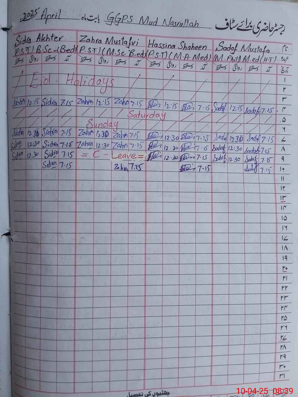 | Leave | Duty | Absent | Maternity | Medical | Ex- Pak |