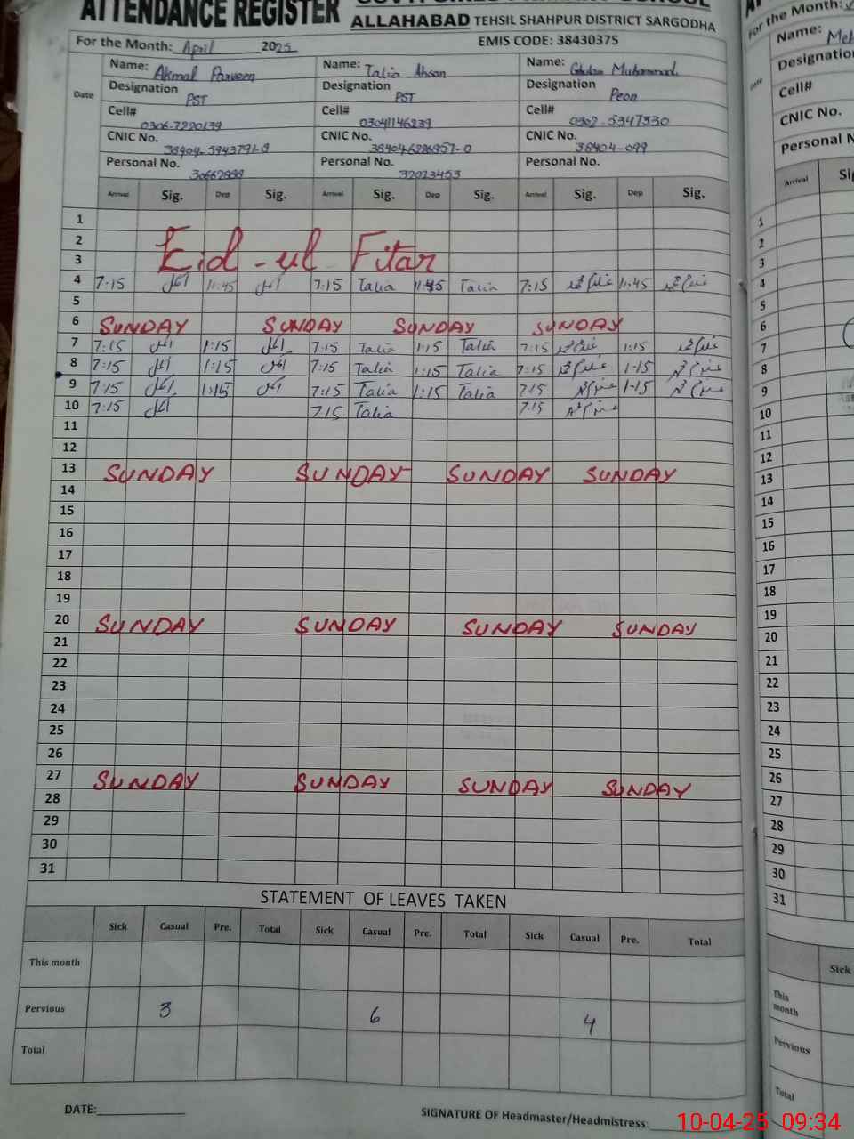 | Name: AK**** PA**** Designation: (School Headmaster's/Headmistress's) PST Phone/Cell Number: 03**** |
