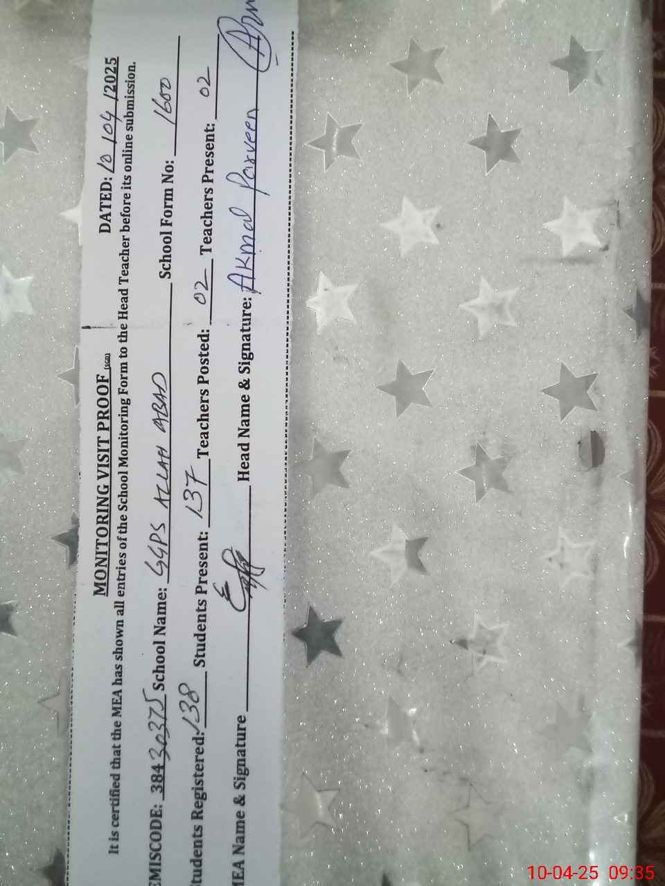| Attendance Register | Head Teacher | MEA with School | Visit Proof |