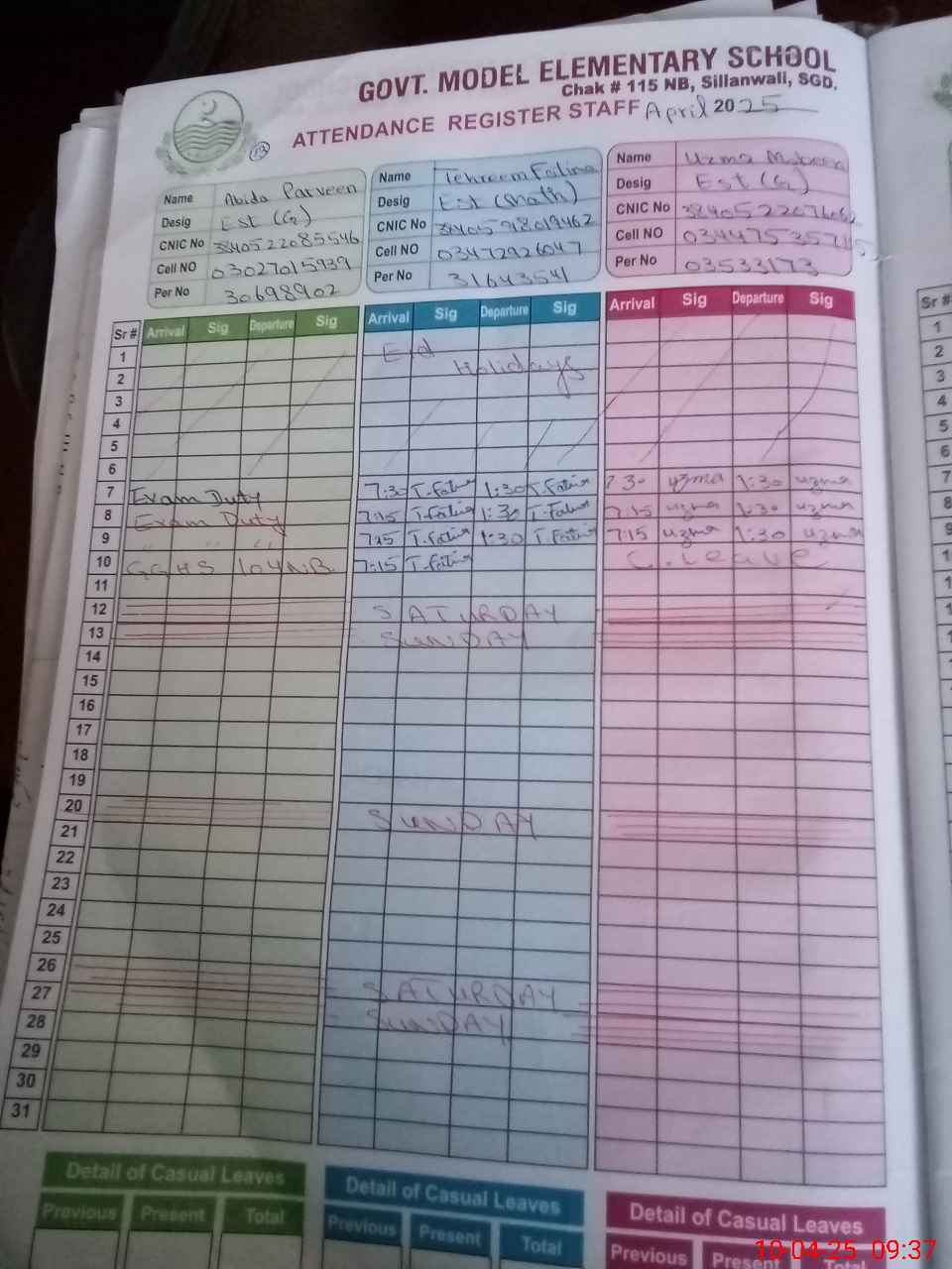 | CNIC | Full Name | Designation | R/C | Absence During Last Calender Month |