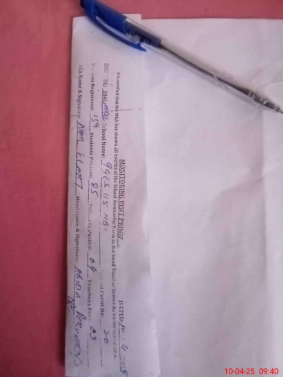 | Attendance Register | Head Teacher | MEA with School | Visit Proof |