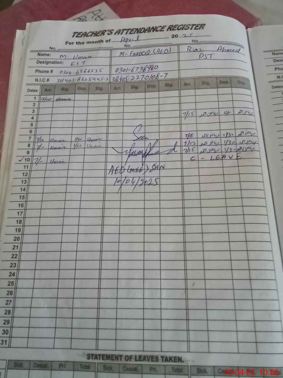 | CNIC | Full Name | Designation | R/C | Absence During Last Calender Month |
