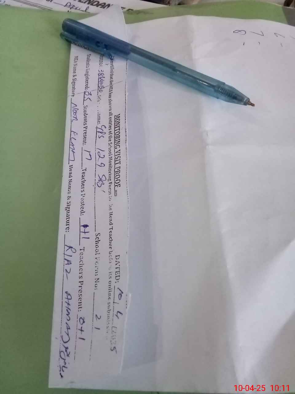 | Attendance Register | Head Teacher | MEA with School | Visit Proof |