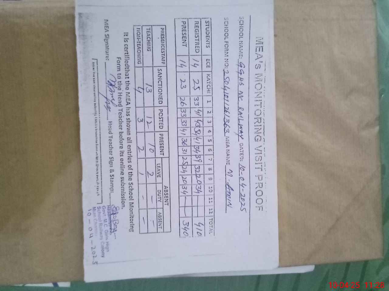 | Attendance Register | Head Teacher | MEA with School | Visit Proof |