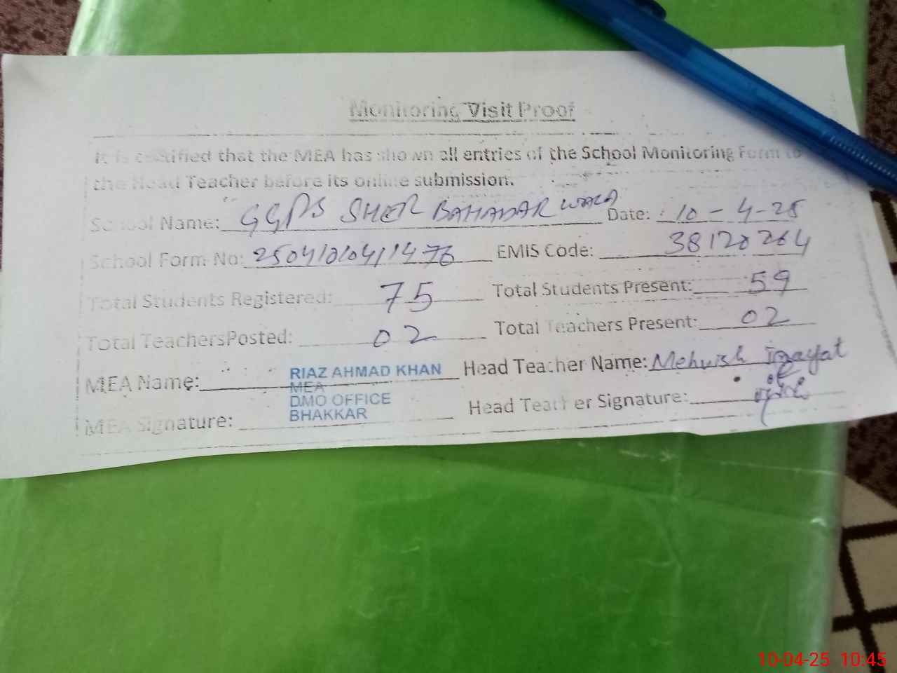 | Attendance Register | Head Teacher | MEA with School | Visit Proof |