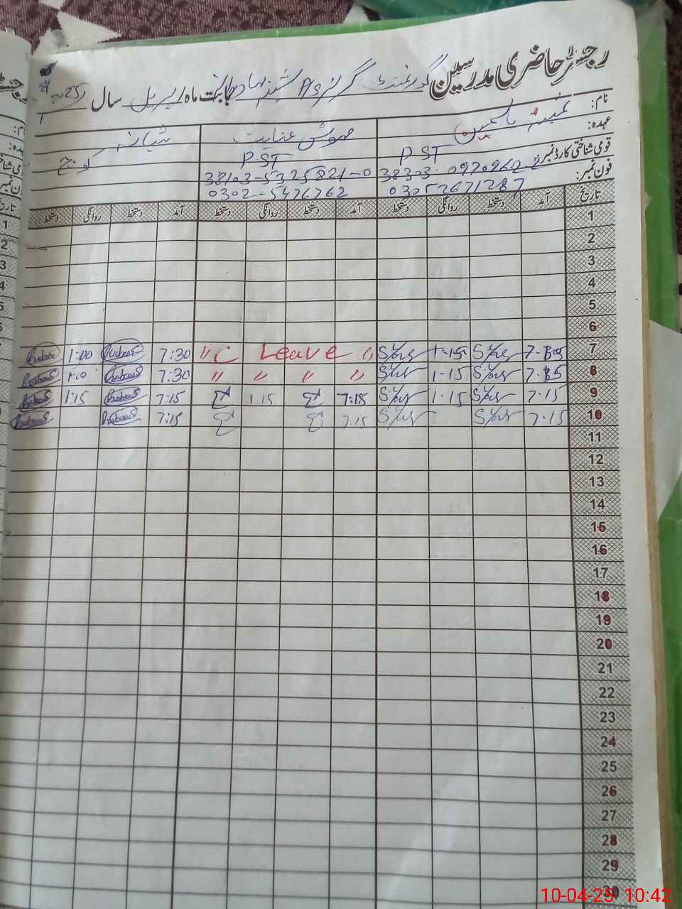 | CNIC | Full Name | Designation | R/C | Absence During Last Calender Month |