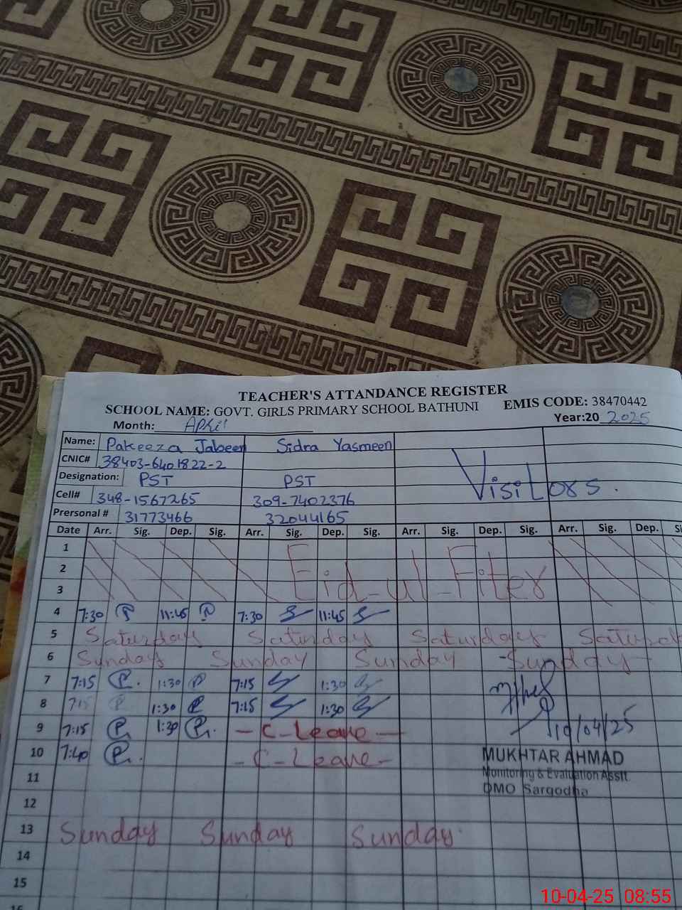 | District: SARGODHA | Tehsil: BHERA | Markaz: WAZIDI - FEMALE | Level: Primary | |