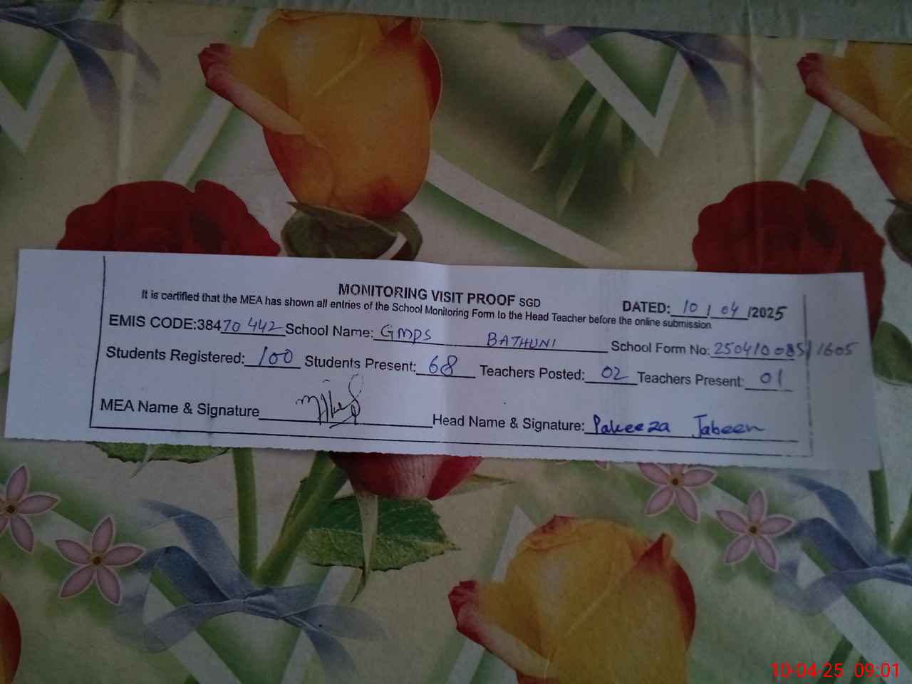 | EMIS Code: 38470442 | Name of School: GMPS BATHUNI | |||