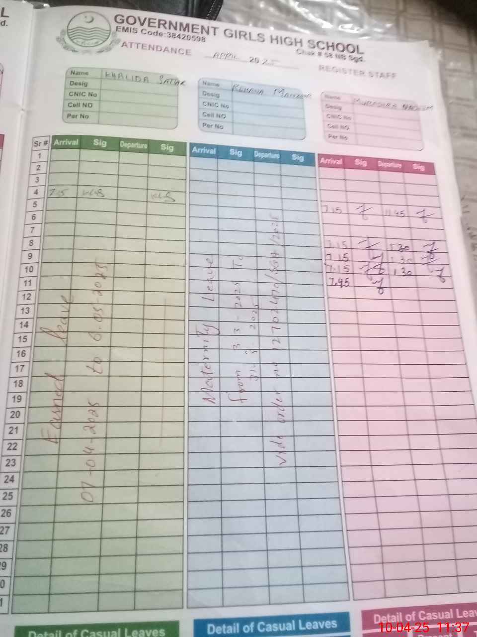 | CNIC | Full Name | Designation | R/C | Absence During Last Calender Month |