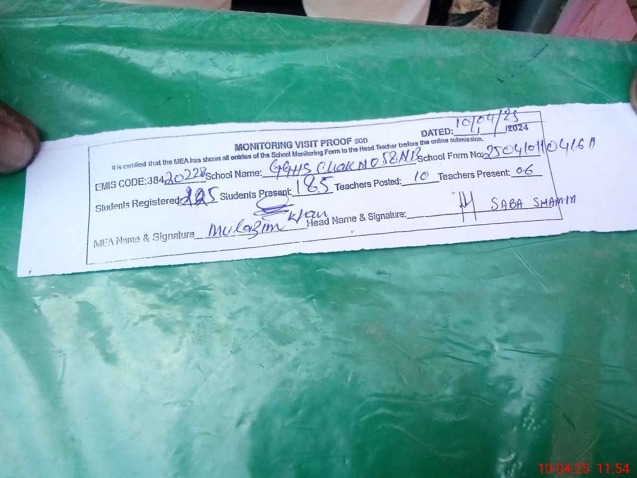 | Attendance Register | Head Teacher | MEA with School | Visit Proof |