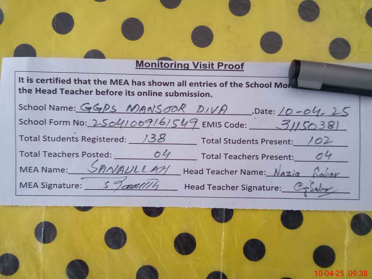 | EMIS Code: 31150381 | Name of School: GGPS MANSOOR DIVA | |||