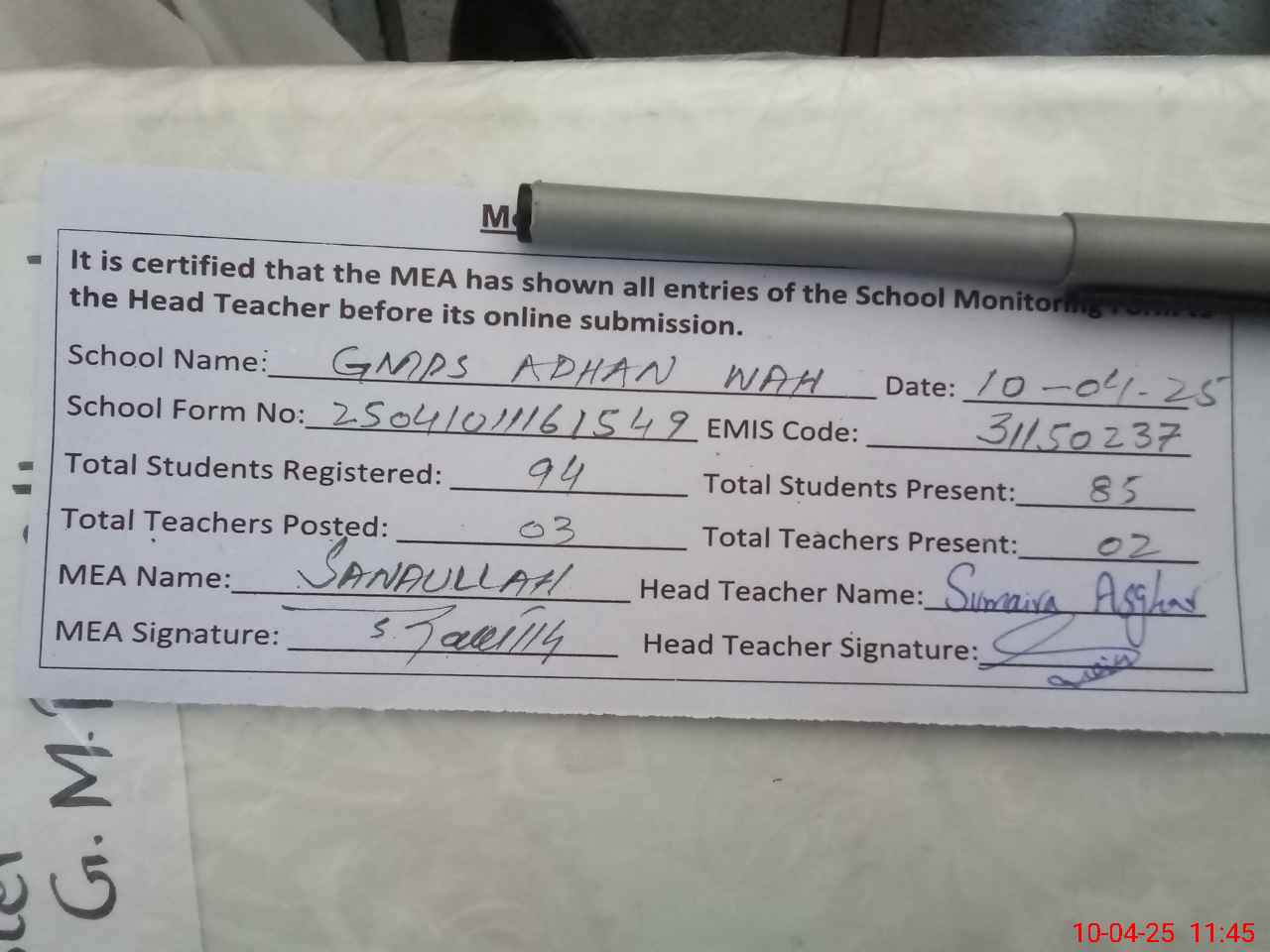| EMIS Code: 31150237 | Name of School: GMPS ADHAN WAH | |||