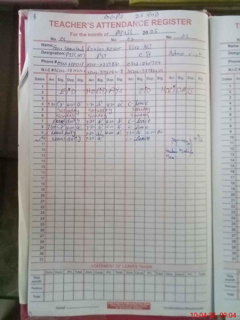 | CNIC | Full Name | Designation | R/C | Absence During Last Calender Month |