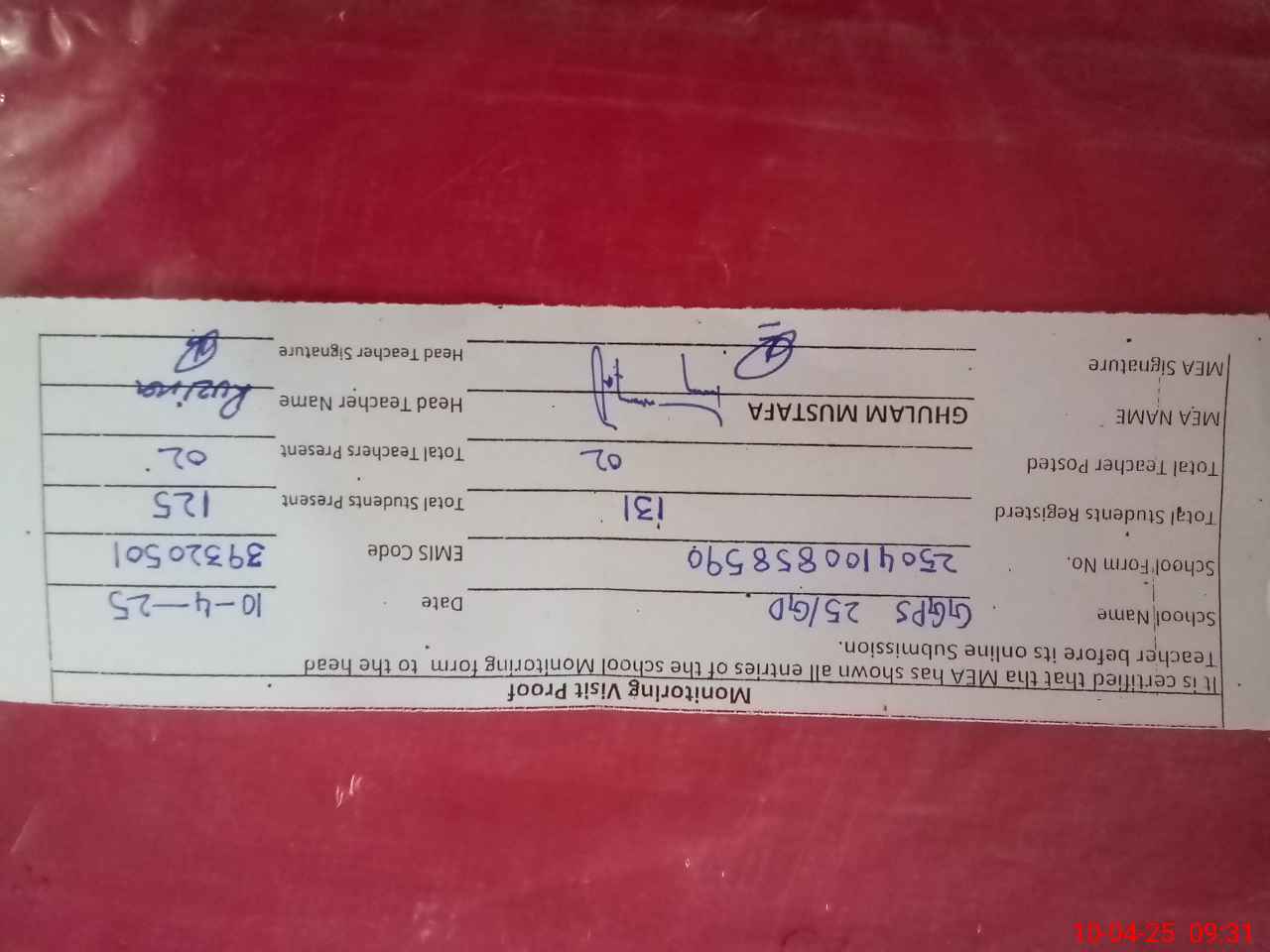 | Attendance Register | Head Teacher | MEA with School | Visit Proof |