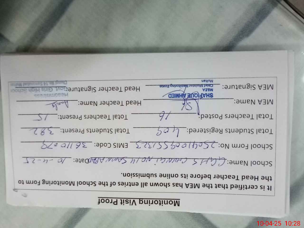 | Certified that this School was Inspected by the Undersigned MEA/DMO Today and the Information Stated Above is as Per Record. | |||||