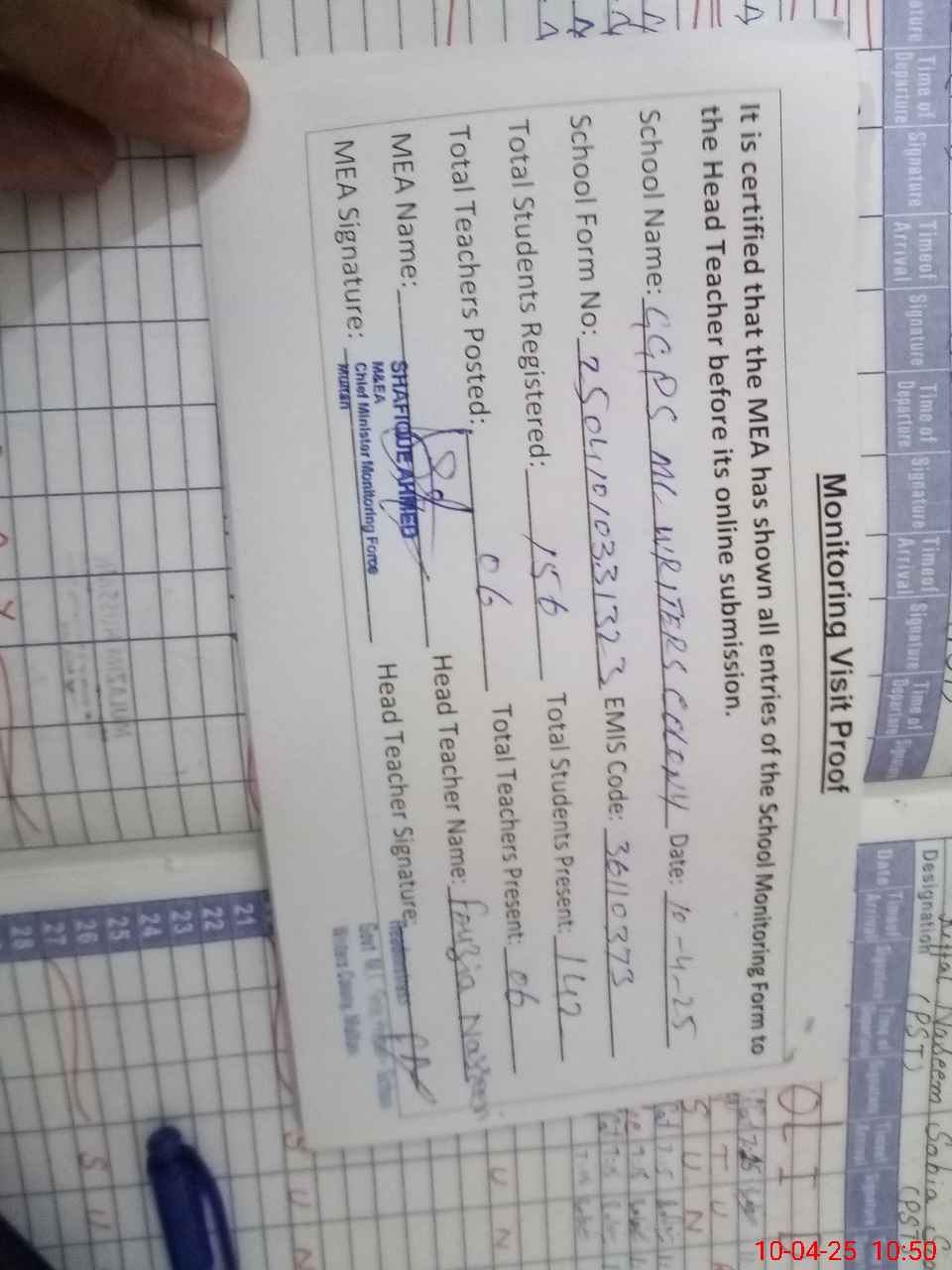| EMIS Code: 36110373 | Name of School: GGPS MC WRITERS COLONY MULTAN | |||