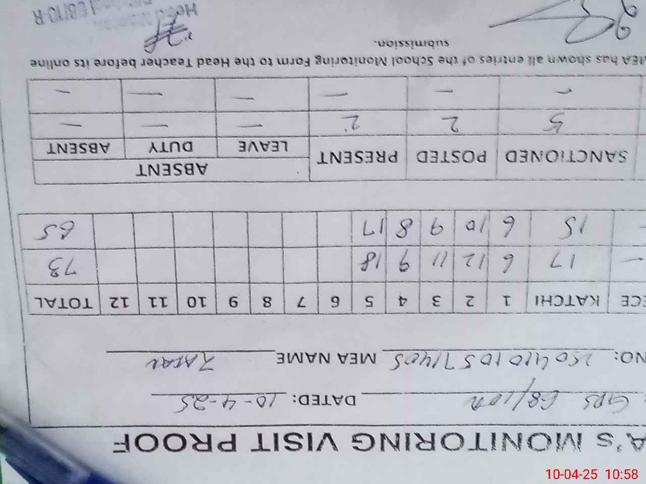| Monitoring Date: 10-04-2025 | Start Time: 10-04-2025 10:33 AM | End Time: 10-04-2025 11:02 AM | Name of MEA: MU**** ZA**** IQ**** | |