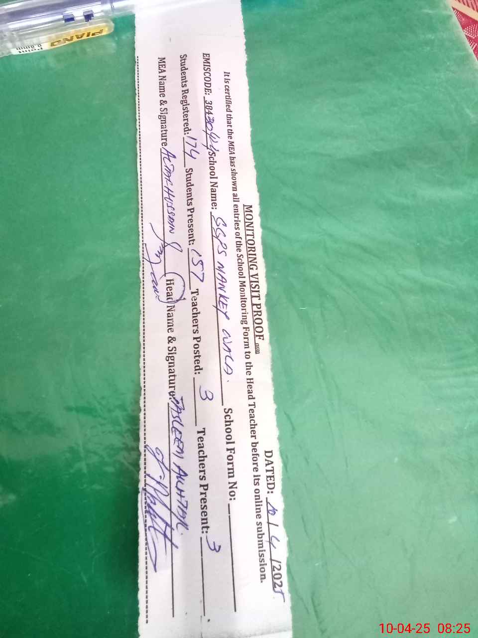 | Monitoring Date: 10-04-2025 | Start Time: 10-04-2025 07:59 AM | End Time: 10-04-2025 08:25 AM | Name of MEA: AL**** HU**** | |
