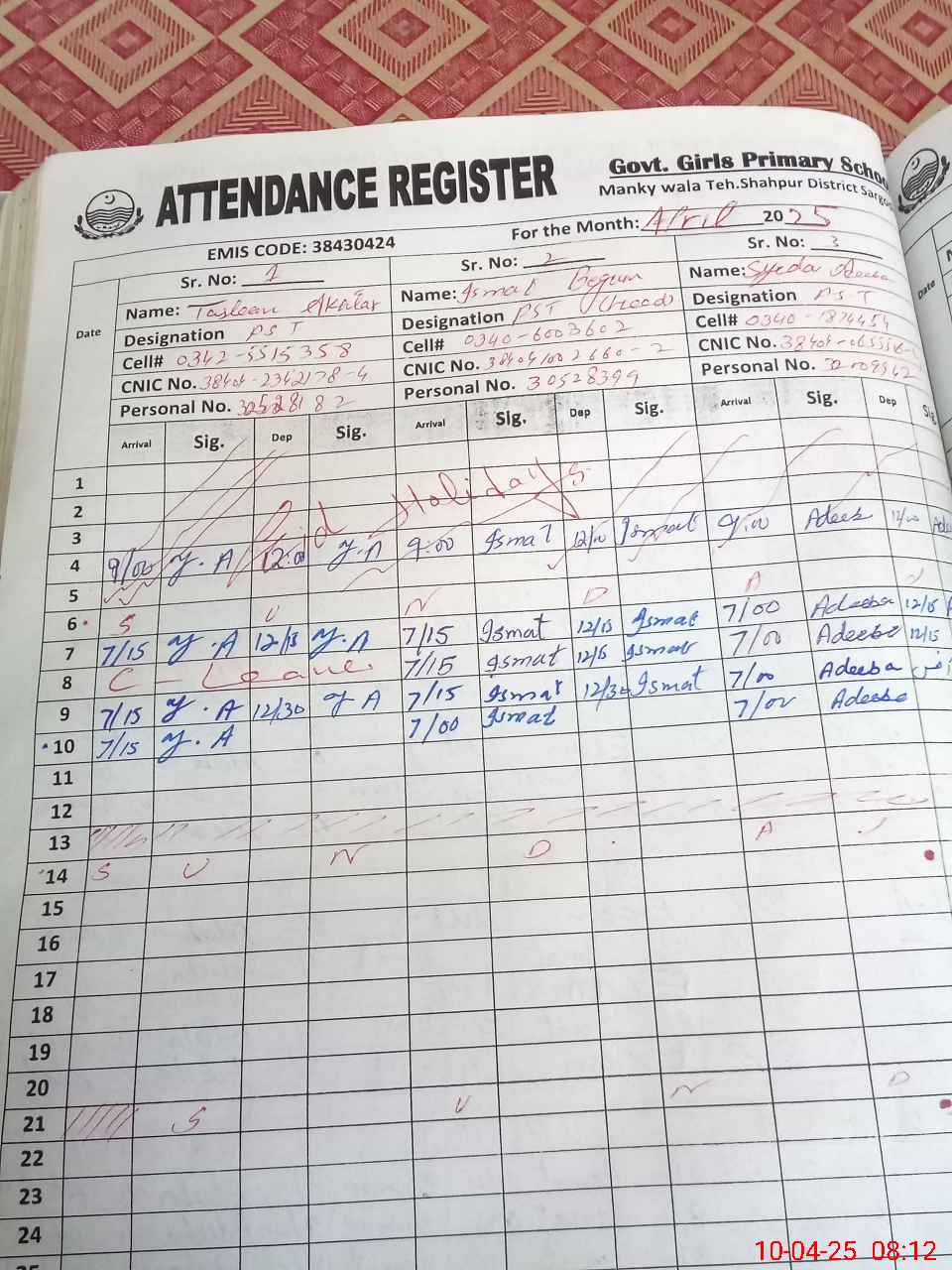 | CNIC | Full Name | Designation | R/C | Absence During Last Calender Month |
