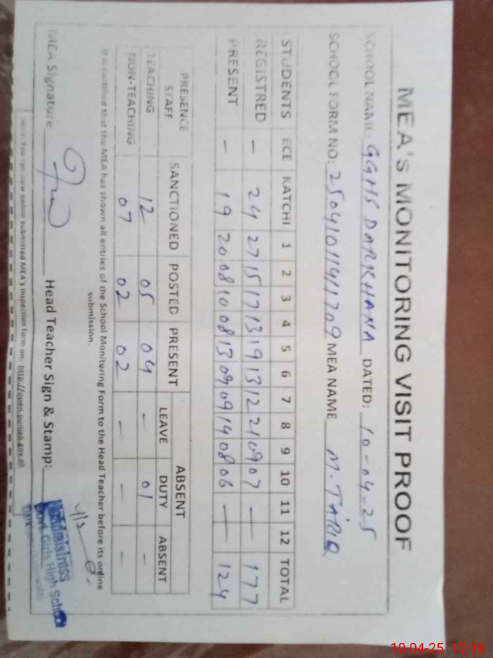 | Attendance Register | Head Teacher | MEA with School | Visit Proof |