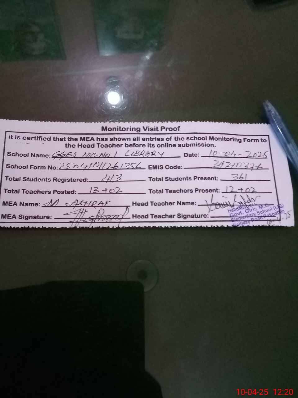 | Attendance Register | Head Teacher | MEA with School | Visit Proof |