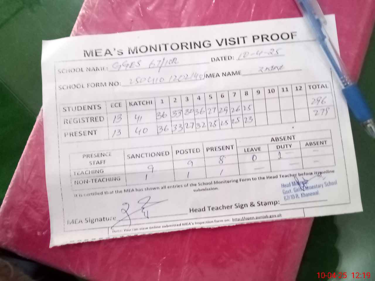 | Attendance Register | Head Teacher | MEA with School | Visit Proof |