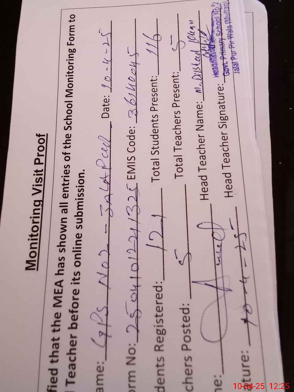| Attendance Register | Head Teacher | MEA with School | Visit Proof |