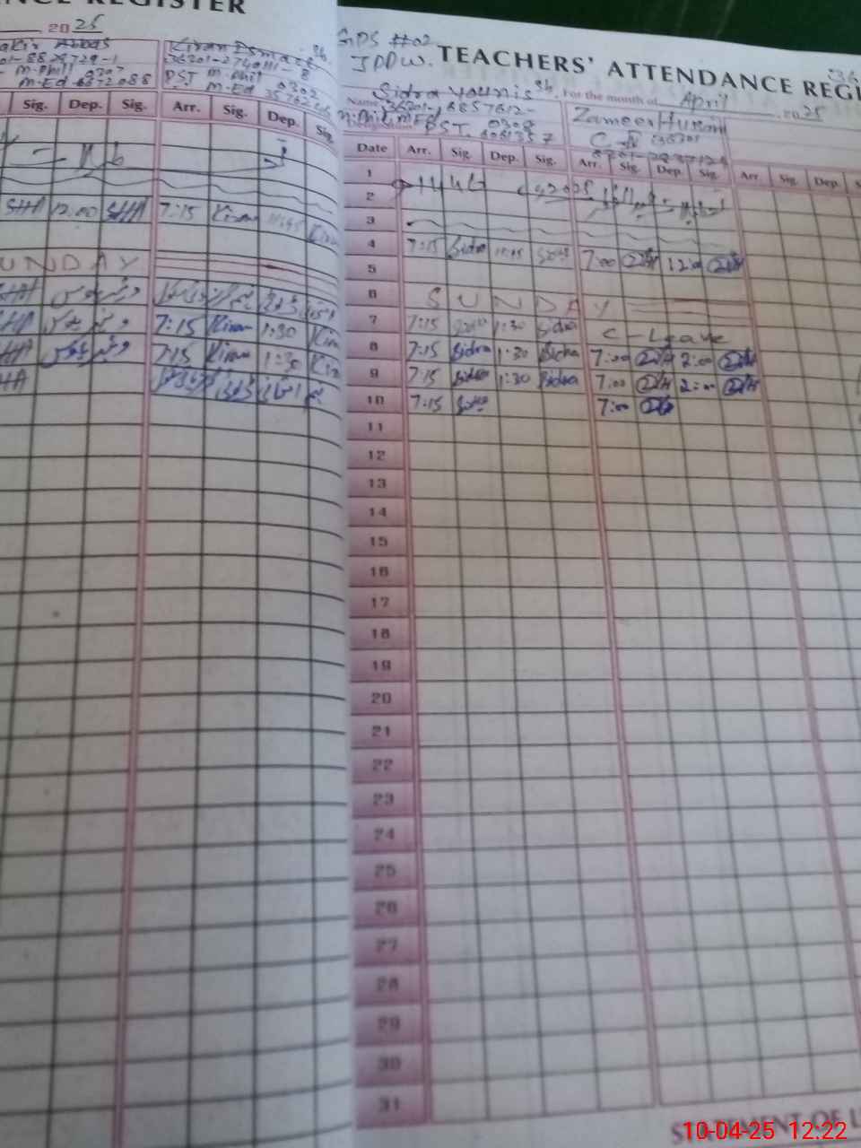 | CNIC | Full Name | Designation | R/C | Absence During Last Calender Month |