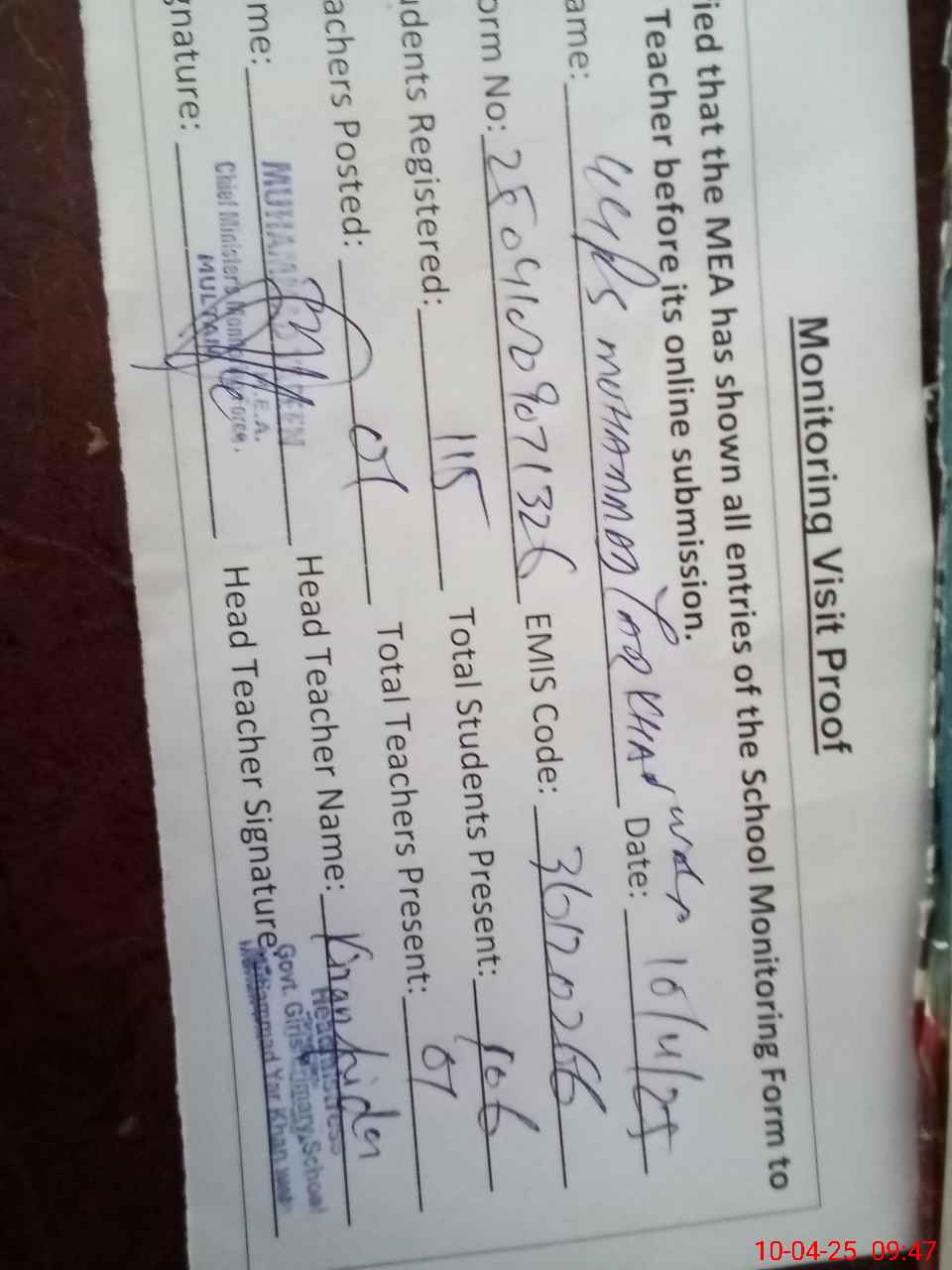 | EMIS Code: 36120266 | Name of School: GGPS MUHAMAD YAR KHAN WALA SHUJABAD | |||