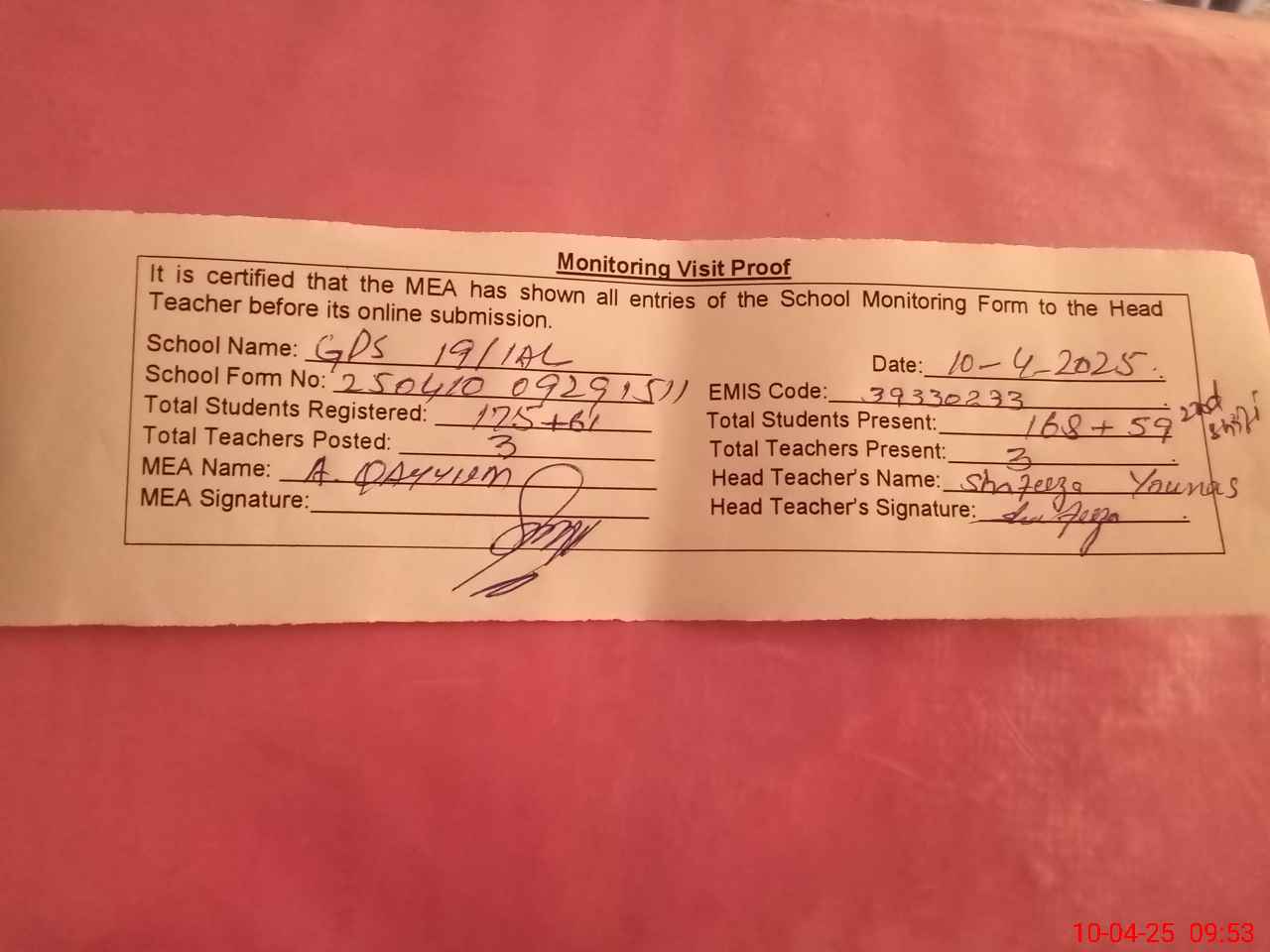 | EMIS Code: 39330233 | Name of School: GPS CHAK NO. 19/1-AL | |||
