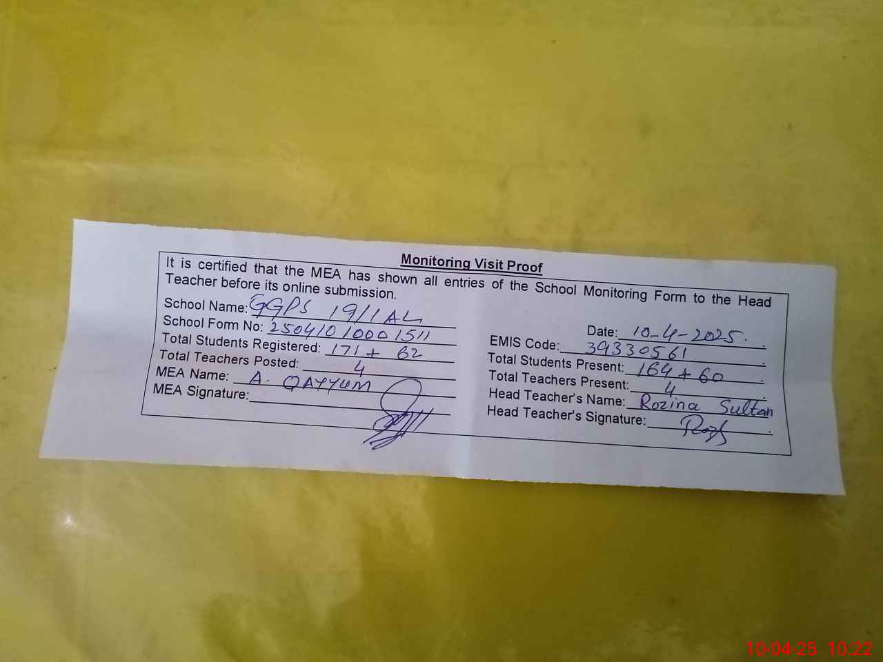 | Monitoring Date: 10-04-2025 | Start Time: 10-04-2025 10:00 AM | End Time: 10-04-2025 10:22 AM | Name of MEA: AB**** QA**** | |