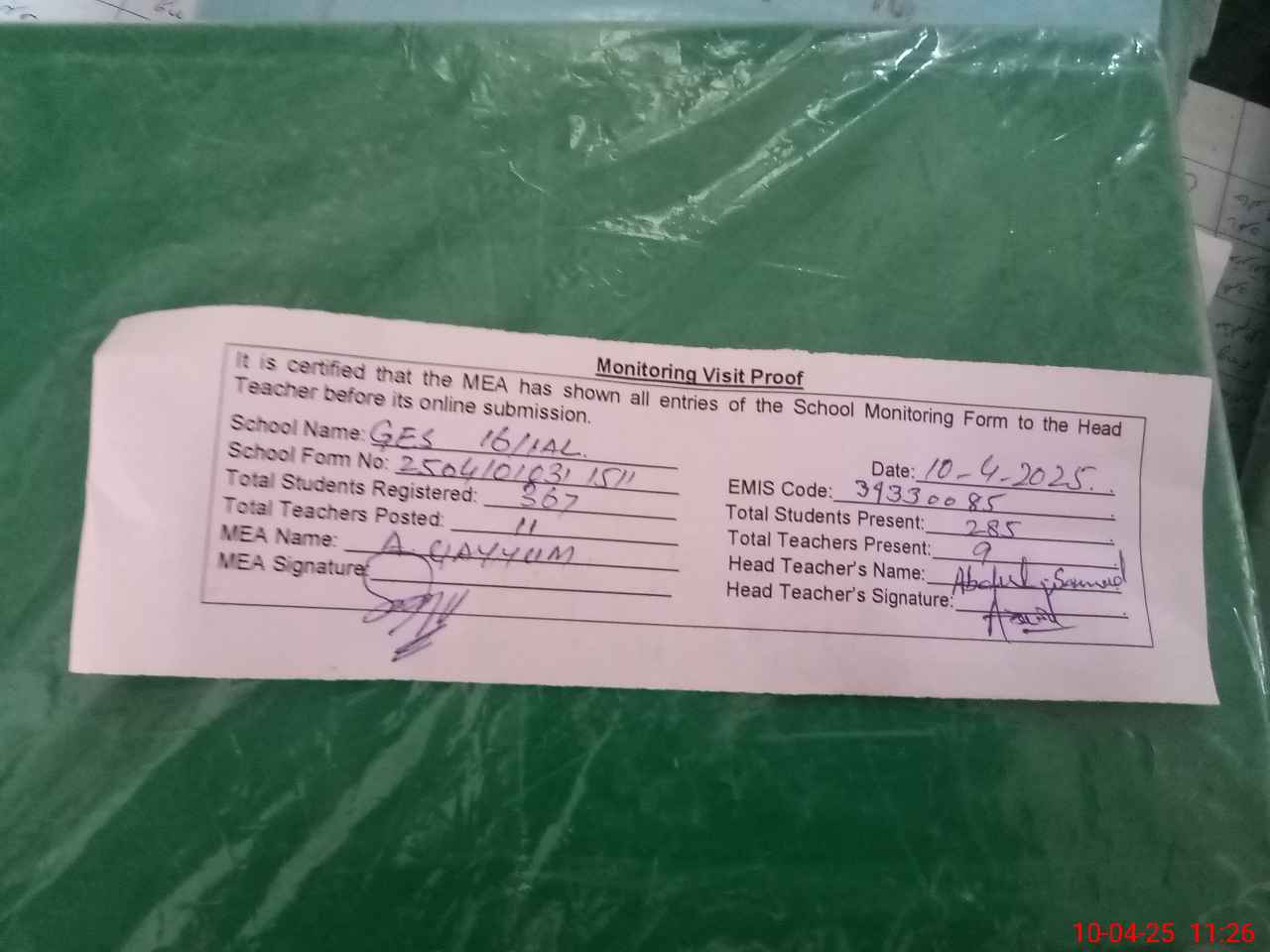 | Attendance Register | Head Teacher | MEA with School | Visit Proof |