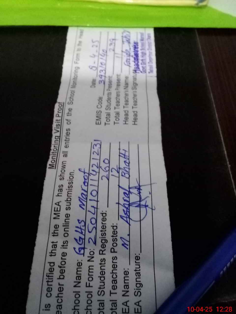 | Certified that this School was Inspected by the Undersigned MEA/DMO Today and the Information Stated Above is as Per Record. | |||||