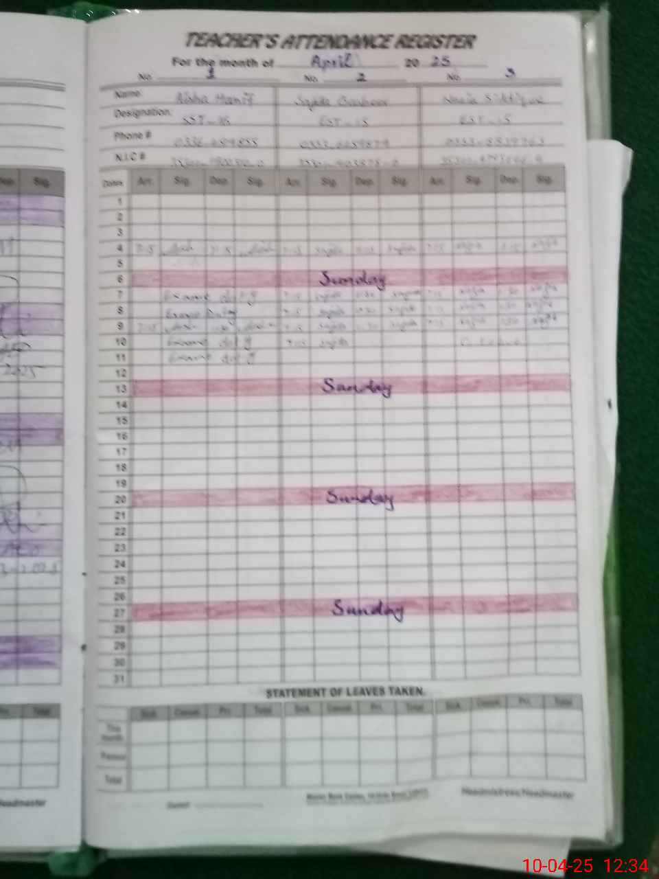 | 35**** | Ai**** Ha**** | 5 | 1 | 0 | 0 | 0 | 0 | 0 | 0 | 0 | 0 | 0 | Exam Duty |