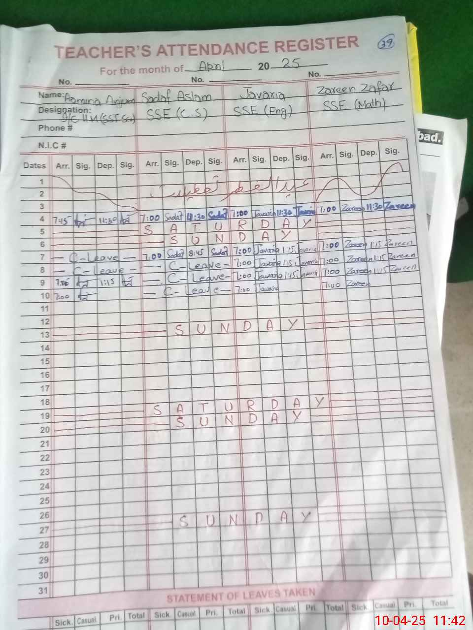 | CNIC | Full Name | Designation | R/C | Absence During Last Calender Month |