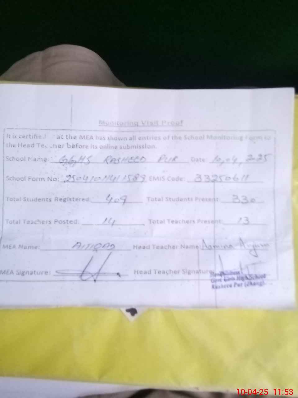 | Attendance Register | Head Teacher | MEA with School | Visit Proof |