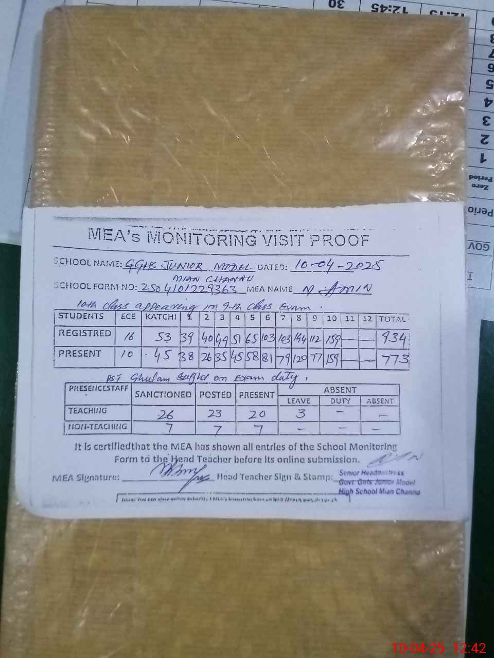 | Attendance Register | Head Teacher | MEA with School | Visit Proof |