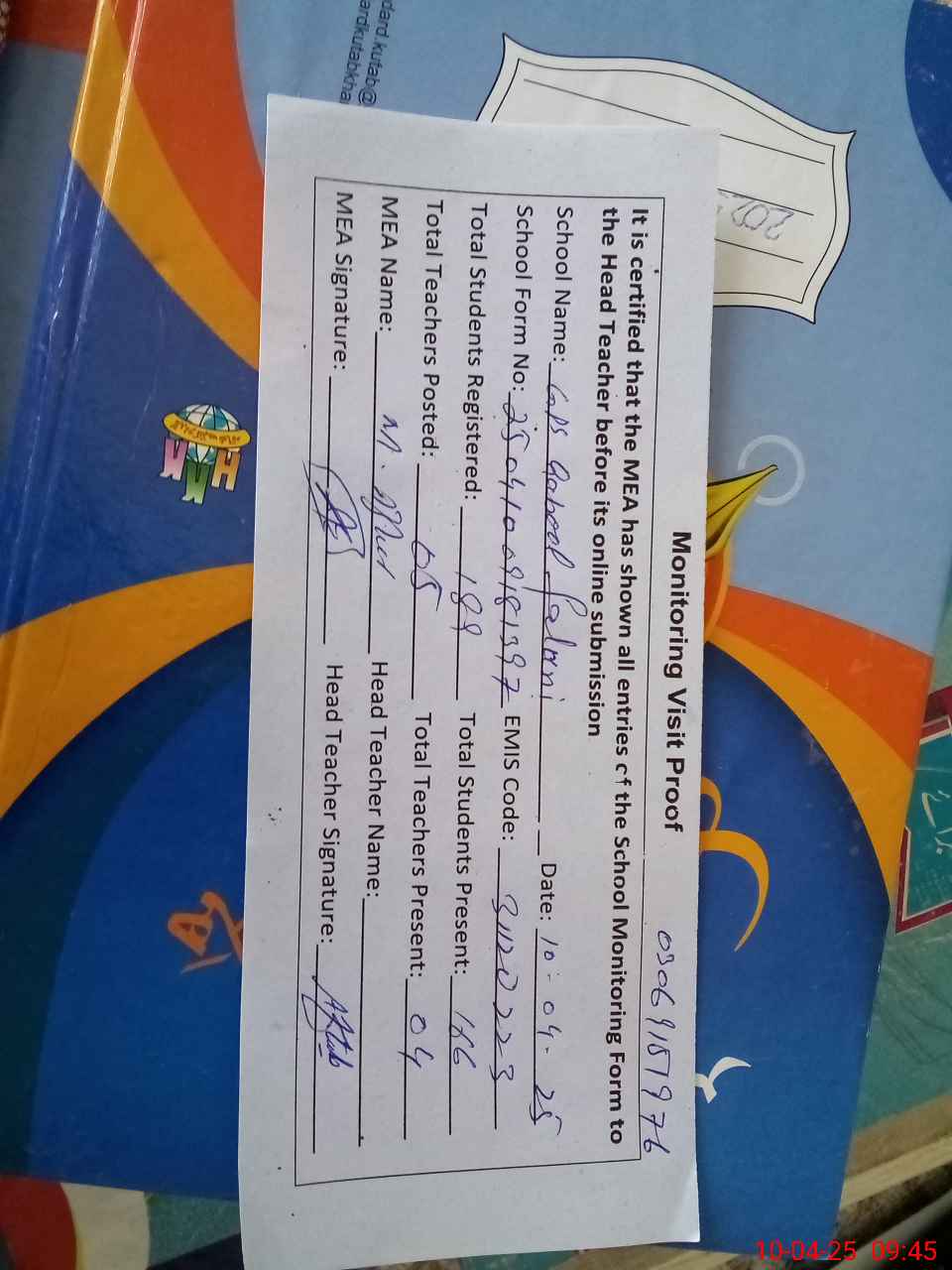 | Attendance Register | Head Teacher | MEA with School | Visit Proof |