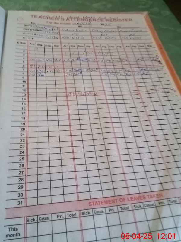 | CNIC | Full Name | Designation | R/C | Absence During Last Calender Month |