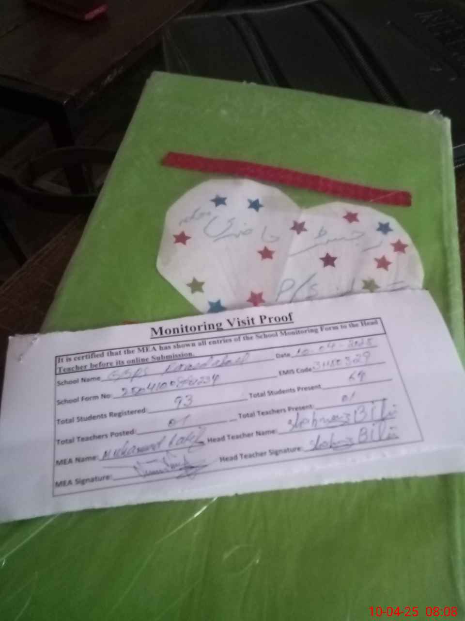 | Attendance Register | Head Teacher | MEA with School | Visit Proof |