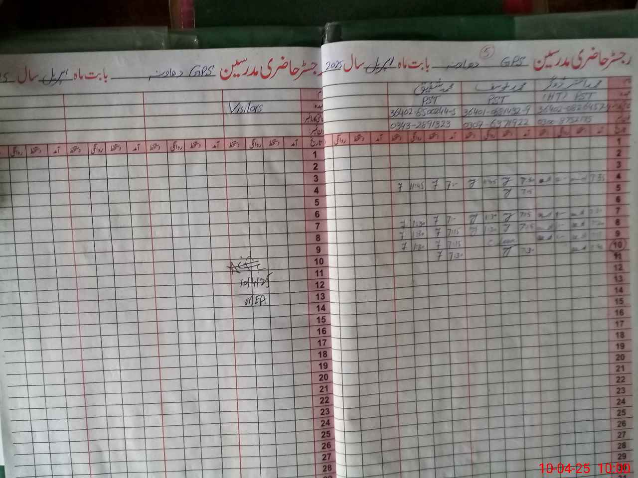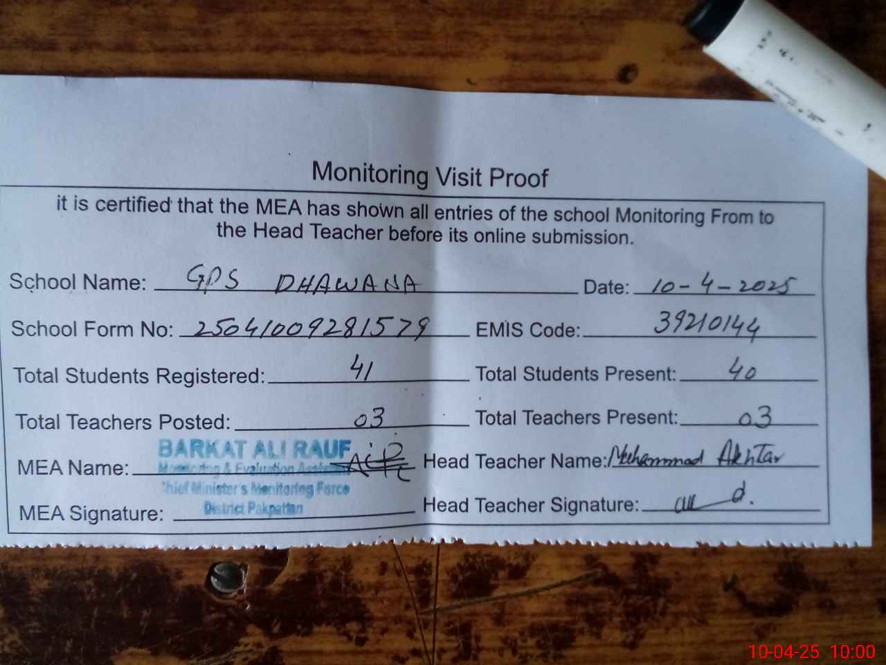 | Attendance Register | Head Teacher | MEA with School | Visit Proof |