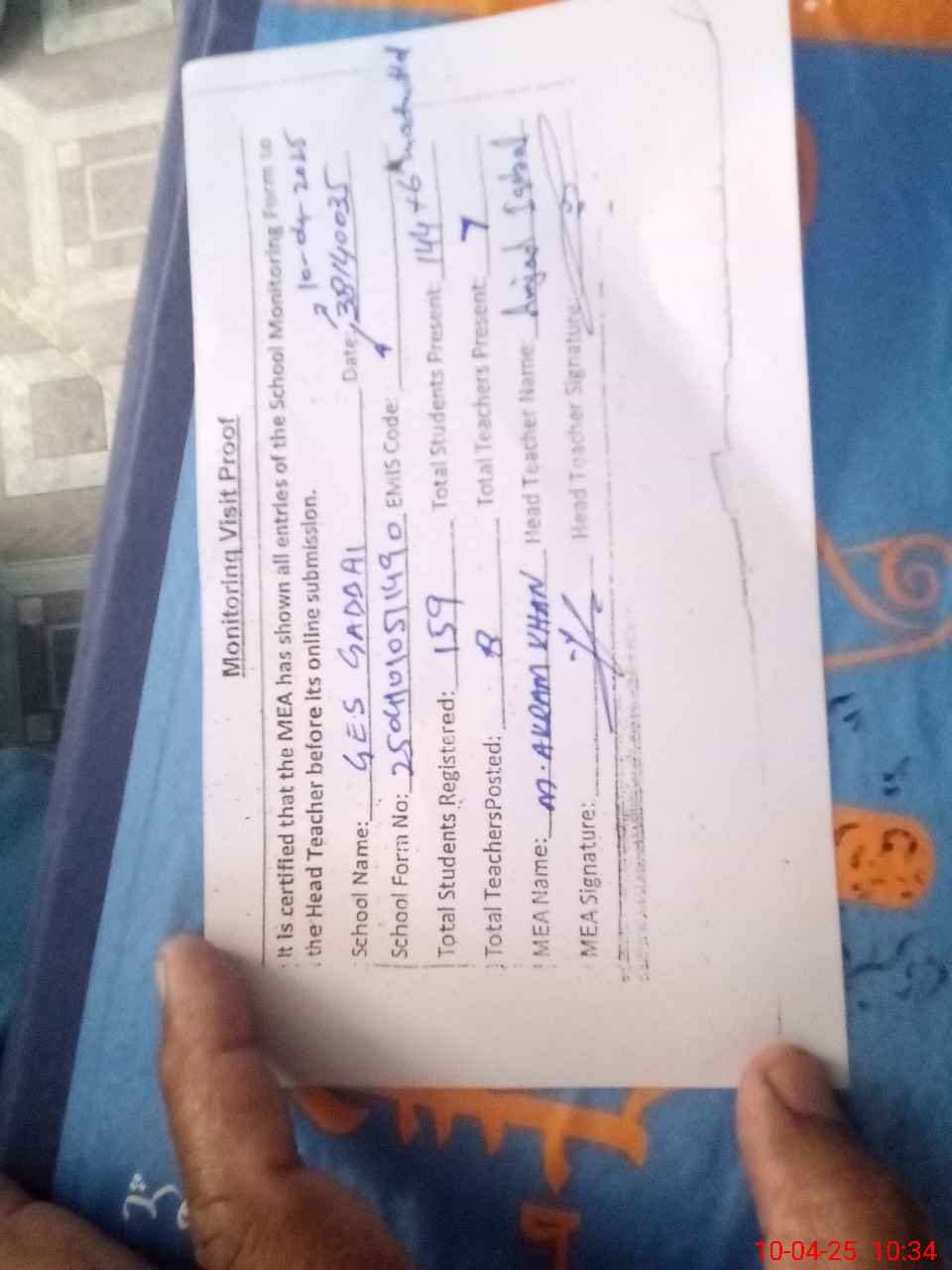 | Attendance Register | Head Teacher | MEA with School | Visit Proof |