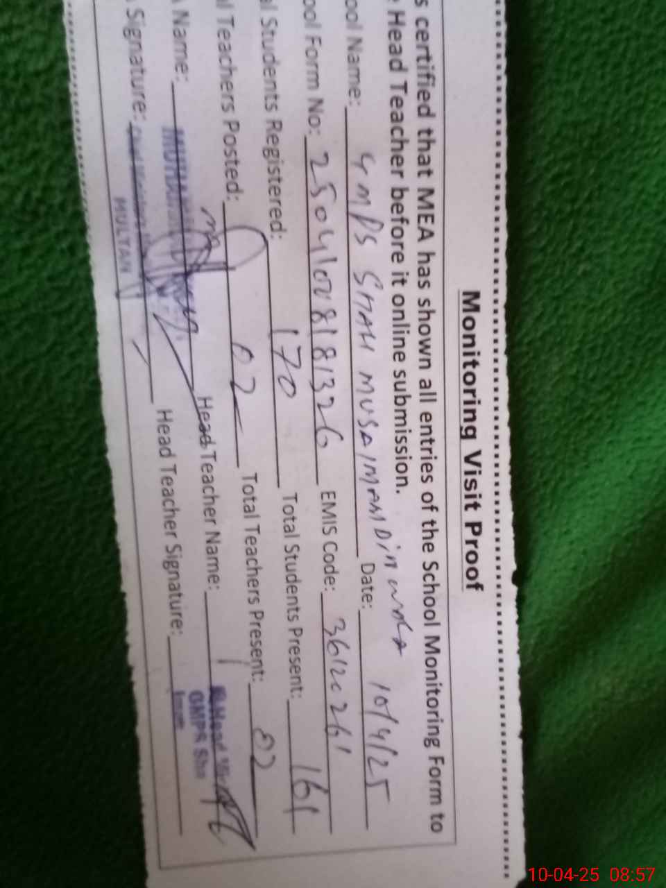 | Attendance Register | Head Teacher | MEA with School | Visit Proof |