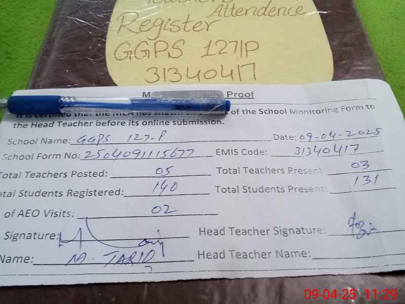 | Attendance Register | Head Teacher | MEA with School | Visit Proof |